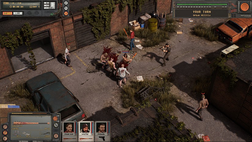游戏使用了行动点回合制系统(类铁血联盟2风格),连续的回合和可中断的基础攻击。我们也试着改良了面对数量多且行动慢丧尸在回合制游戏的缺点,即我们把丧尸作为一个整体,所有的丧尸一同行动,但又有单独的AI。