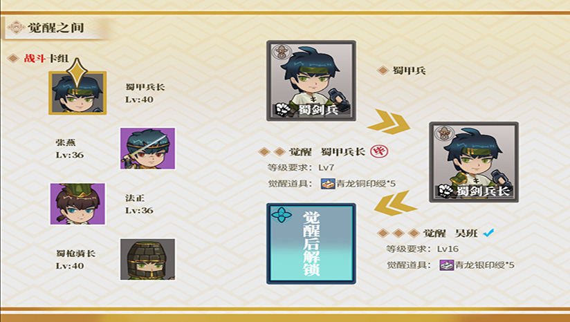 本游戏并不设置内购功能,所有武将均可通过游戏内货币抽取,部分武将可以进一步觉醒为更强形态。“朝为田舍郎,暮登天子堂。”大多数低稀有度士兵牌也可以通过觉醒系统晋升为名将。