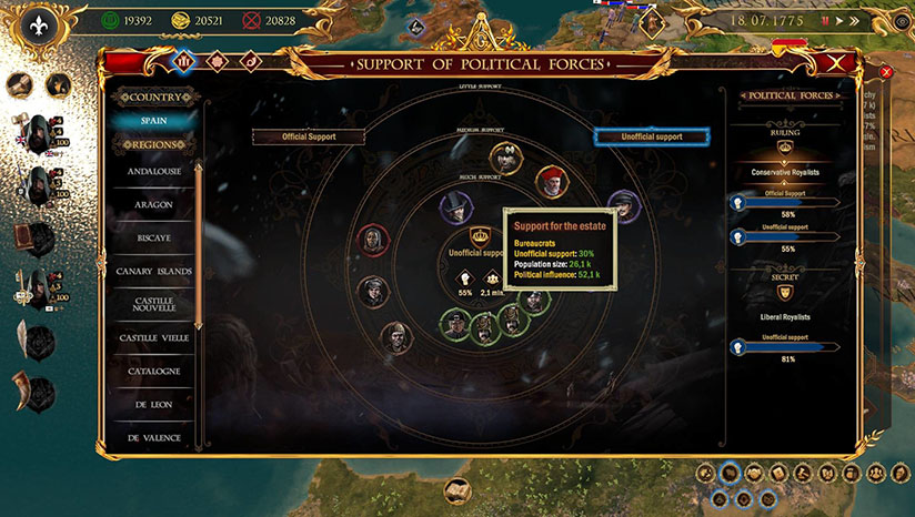 要注意,统治者们有着自己的打算,你在游戏过程中只能施予间接操纵。你并没有权利直接命令君主向邻国宣战,但是你可以选择将己方成员安插在政府要职之中,通过各种间接手段破坏两国双边关系,制造边境矛盾,并借此引发武装冲突。