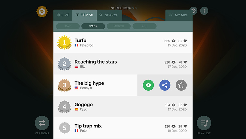 录制并和全世界玩家分享你的创作!如果获得足够的票数,你的混音作品就会出现在Incredibox Top 50排行榜里。