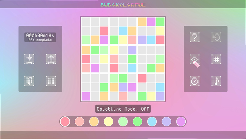 《Sudokolorful》是由OriOpa Studio制作并发行的一款休闲益智游戏,游戏延续了数独的玩法,只不过其中的数字都由颜色替换,你需要让同一行、同一列、同一大方格中的颜色都不相同,将小方格全部填满即是完成挑战。