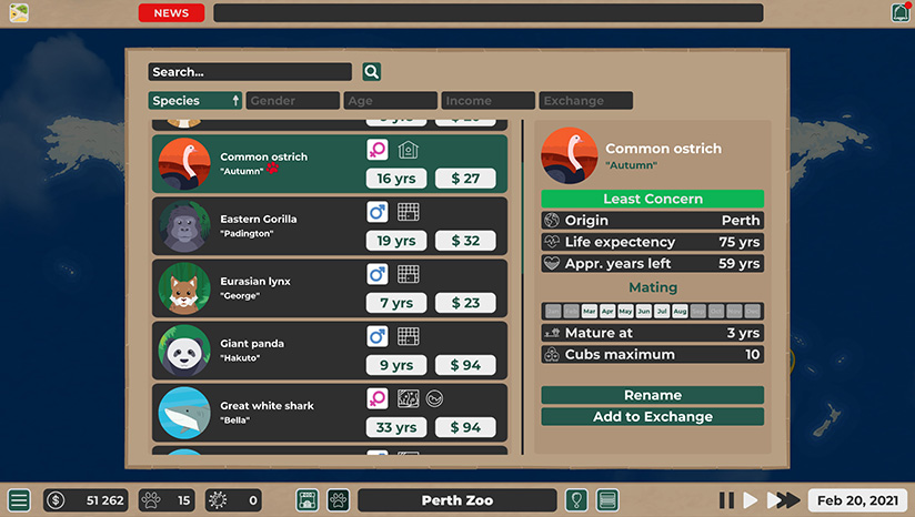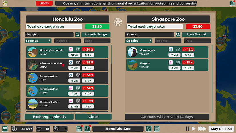 《Zooconomy》是由Curious Foxes制作并发行的一款策略沙盒模拟游戏,在游戏中玩家将成为一家动物园的园长,最近你的动物园需要引进一批动物,但是为了节约成本你可以选择与其他动物园进行交换,利用自己多余的物种来换取自己需要的物种。