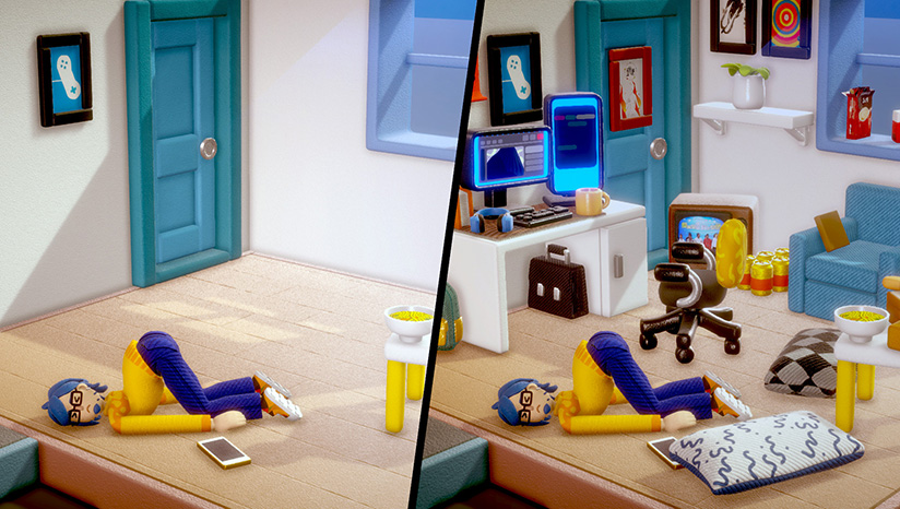 随着游戏进程,你会陆续获得新的家居用品用来布置房间,房间是否整洁美观不仅会影响你的观感,更会直接影响到你的游玩体验,因为房间就是游戏的关卡和战场,游戏的挑战就发生在房间里。期待每位玩家可以摆出自己的个性小屋,演出自己的搞笑生活情景剧。