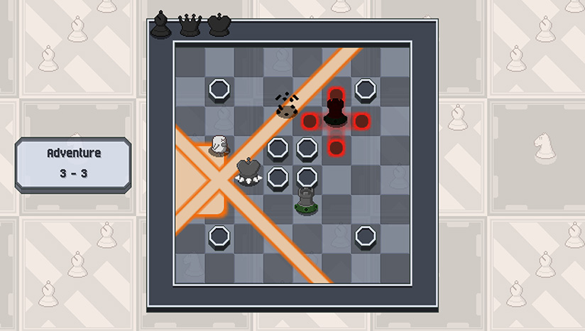 在冒险模式中打败各种各样类型的怪物和boss。游戏的灵感来自于国际象棋的棋子移动方式。避开横冲直撞的城堡,不要被主教的对角线炮弹给炸到,并注意骑士的践踏。