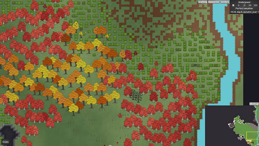 每张地图都是从一个初始种子(大量)随机生成的,所以没有两张地图是相同的,除非你选择使用相同的种子!游戏美术资源的创建方式使得游戏引擎可以将它们绘制成近乎无限的颜色变化——因此每棵树、植物和角色都有自己独特的颜色和外观组合。