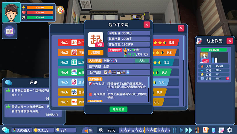 对于一名网文写手来说,首先需要选择签约入驻小说网站,游戏中提供给玩家几十个小说网站可供选择。随着写作实力的提升,你也将有机会与大型网站签约,获得更加丰厚的报酬。