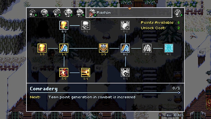 每件被发现、购买或被盗的装备都是每个角色的永久、独特的升级。玩家购买升级而不是购买替代品。再也不用在城里买那个很棒的头盔了,只是偶然发现一个更好的头盔作为地牢中的宝藏。每个角色有3个装备槽,每个装备8个升级,总共192个。该系统避免了库存管理的乏味,同时也为完成主义者提供了一些有用的东西来寻找。