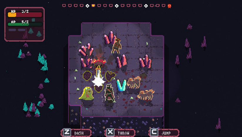 从一个方格跳到另一个方格,对周围的敌人造成眩晕效果。如果有你的剑,或者只有在你没有剑的情况下推动他们。