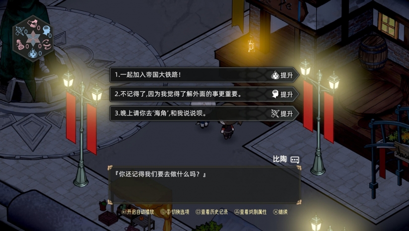 本作采用俯视角即时战斗系统,玩家可操控希德使用近战武器或远程枪械,搭配炸弹、狙击枪等副武器形成多样化攻击组合。战斗核心机制围绕“时停”展开:托莉可短暂冻结时间,无视敌人的护盾“刻”直接攻击,为战局创造突破口。角色成长方面,希德的武器可通过强化分支改变攻击模式(如近战爆发或远程控场),而托莉拥有独立的技能树和两种战斗风格——“红莲”(近战刺客)与“浮叶”(远程辅助),玩家可根据战况自由切换。此外,游戏引入“戏剧属性”系统,玩家在对话中选择不同倾向(热血、理性或街头习性),将影响支线任务解锁、剧情走向及最终结局。