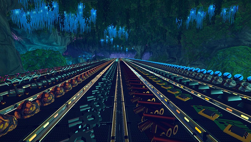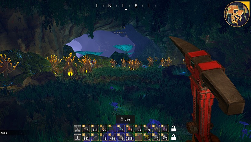 以第一人称视角,探索《Technotica》中那长满发光植物的洞穴深处。