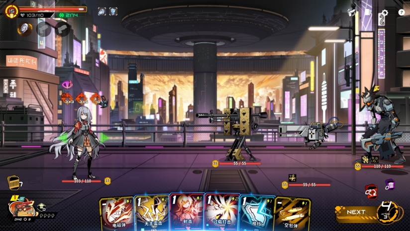 游戏采用科幻卡通美术风格,角色立绘以二次元精致画风呈现,三位女主角设计各具辨识度(如武士安提普奥的日式装扮、夏洛特的机能风服饰)。场景设计上,上城区的科技感与下城区的破败阴郁形成鲜明对比,配合简洁的UI界面与技能特效,营造出赛博世界的诡谲氛围。战斗中的位移动画、武器充能特效等细节流畅,增强视觉反馈。