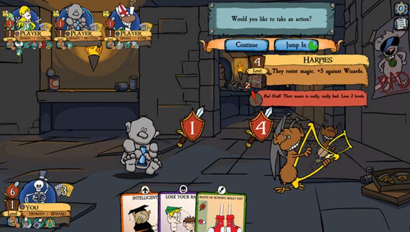 Munchkin在一系列回合中使用门卡和宝藏卡来探索地牢。