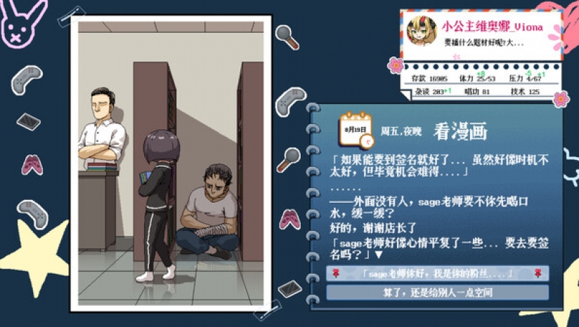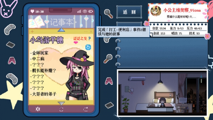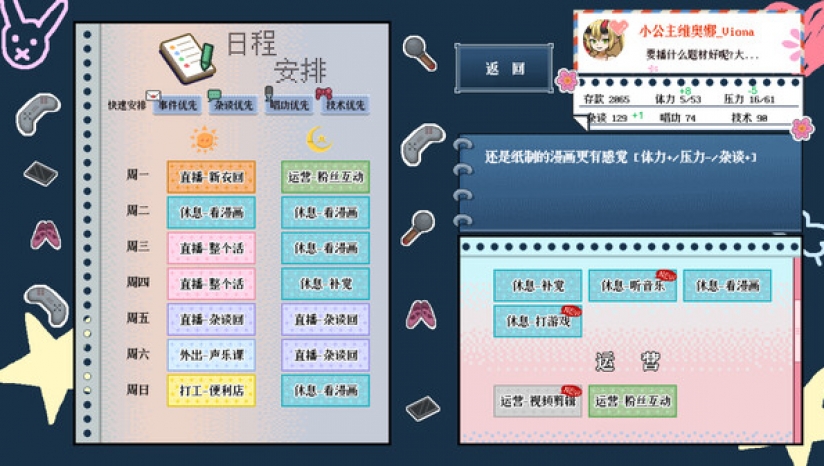 玩家需要为维奥娜安排日常生活,包括直播、交友、阅读八卦、与粉丝互动等活动。合理安排时间和活动,有助于提升维奥娜的各项属性,如唱功、杂谈力、技术力等。