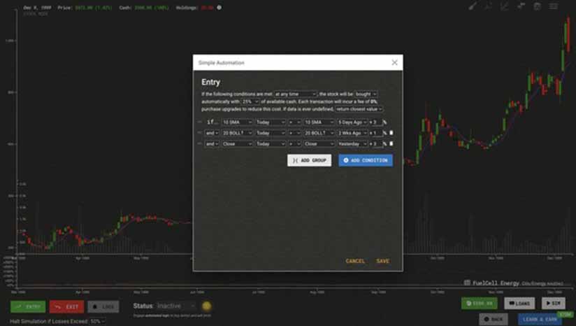 在将经济学中称为“回溯测试”的过程游戏化的过程中,Trade Bots玩家根据早在20世纪50年代至今的真实历史股票/TETF/加密数据测试自己的交易策略。在活动过程中,使用定制的可视化节点编辑器设计复杂的交易机器人。该引擎非常灵活,几乎可以适应任何可以想象的交易策略,同时不需要编程背景。高级解锁允许玩加密货币、交易所交易基金,并能够与其他玩家共享您的机器人。