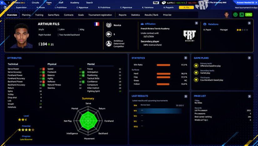 在《2023网球经理》中,战略管理是您成功的关键。确保金融稳定,谈判合同,明智地进行结构性投资,以实现短期和长期目标。你敏锐的决策给你苛刻的董事会留下深刻印象,并成为你自己教练和管理风格的参考。