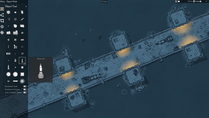 您可以使用可以随时调整的路径和绘图来定义地图。自动放置对象支持您。通过这种方式,您可以直接创建一堵带有塔楼的墙,也可以简单地创建一整片森林。不必放置和调整单个对象,而是可以直接随机更改对象特性,并使用对象类别创建不同的贴图,而无需付出额外的努力。这些对象也可以进行组合。例如,您可以将板条箱放置在塔或墙上,然后将它们一起移动。