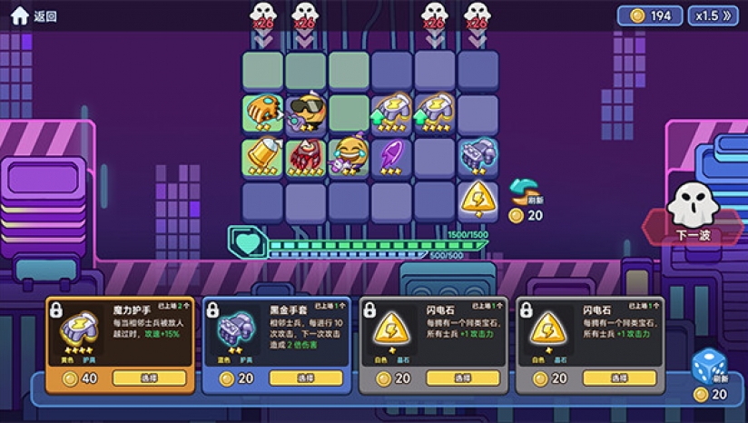 需要选择合适的emoji射手和道具,放置到阵中,射手和道具会作为塔防要素随机分布,有几率打出极高伤害;