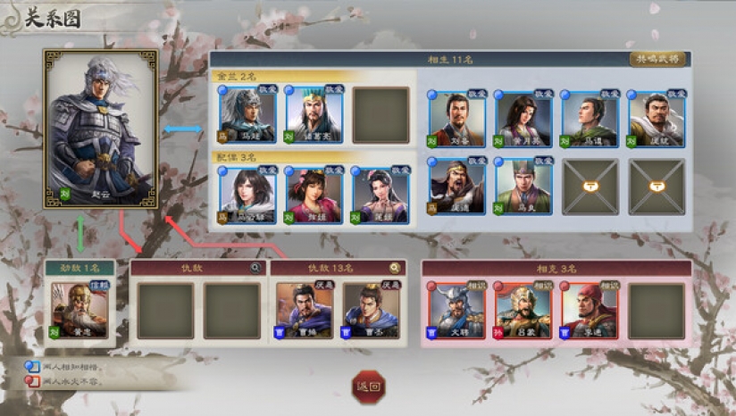 2、鲜活描绘人间戏剧,追加众多魅力十足的新要素:拥有特别关系的“宿命”之人登场。各武将之间的关系可在“关系图”中一目了然,由之产生的“合作”也将大幅影响游戏历程。此外还追加了可自由选择事件展开的“演义传”等众多丰富人间戏剧的新要素。