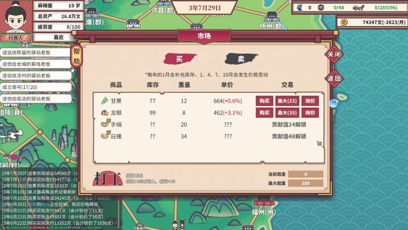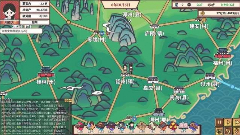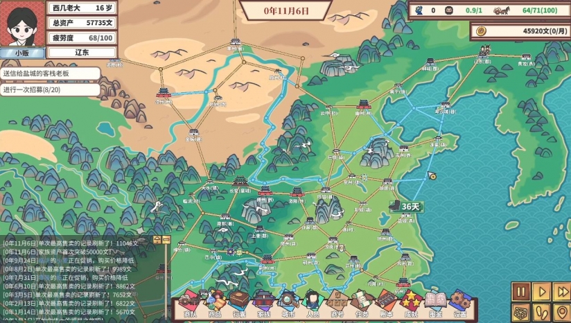 简中《中华一商:传承》是一款精彩的古代贸易模拟经营游戏。玩家将从一无所有的穷伙计起步,在架空的古代中华世界中,穿梭于超过80个基于真实地理命名的城市。游戏中有89种商品,价格随时间波动,玩家需精准把握时机低买高卖。玩家不仅要运输紧缺商品完成商单获取高额利润,还得应对路途中的各种随机事件。此外,作为家族族长,结婚生子、培养后代、传承家族事业也是重要内容。在这里,你可以体验从白手起家到富甲天下的传奇人生。