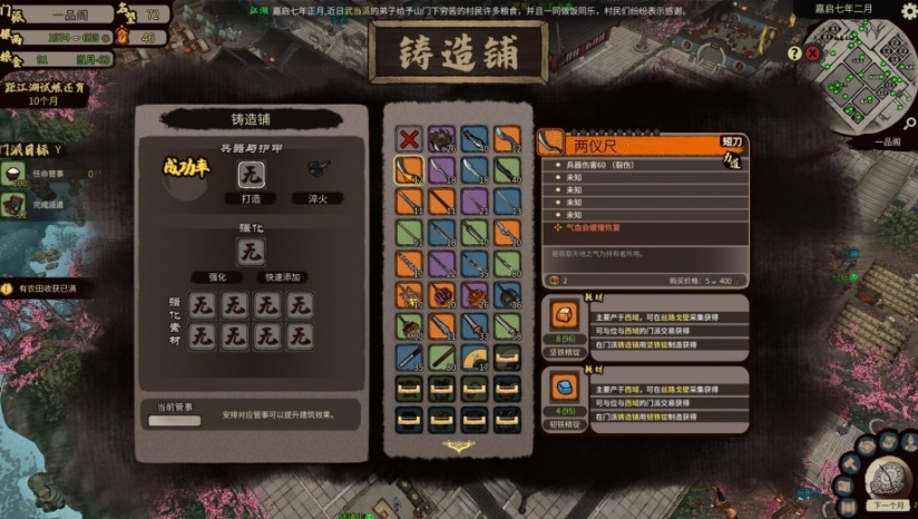 铁匠铺提供打造功能,可以为弟子打造神兵利器,提升门派底蕴。