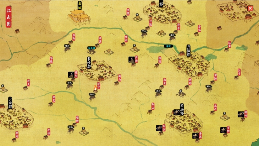 开局游戏世界中大部分区域被叛军占领,玩家可以通过奏请朝廷、借兵、率自己部众等方式攻打叛军,或者离间、劝降叛军,以此平定叛乱,授功封爵(当然也可以暗中资助叛军)。最终大权独揽,权倾朝野。