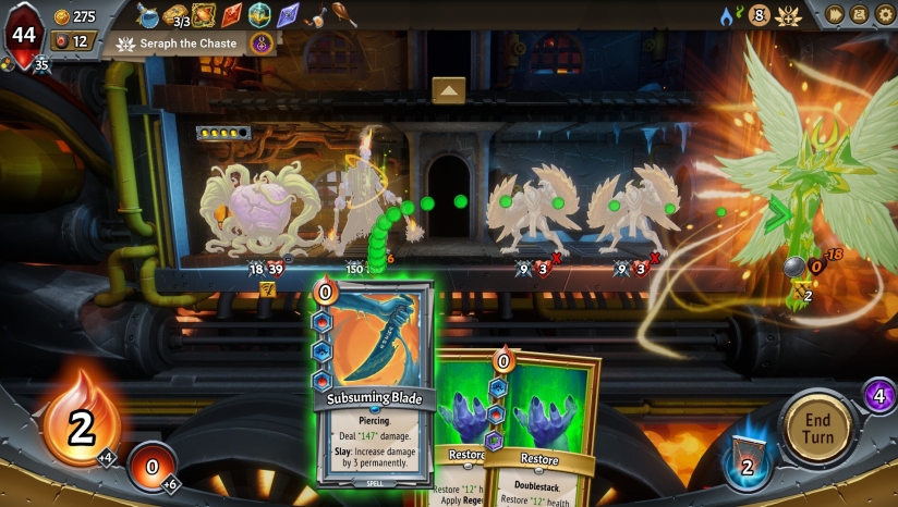 怪物列车采用了独特的艺术风格,将地狱的阴森与魔鬼的力量完美结合。游戏中的卡牌和角色设计都充满了创意和细节,让玩家在游戏中感受到一股浓浓的地狱气息。游戏中的战斗发生在一辆三层的火车上,敌人将从底部右边的大门进入。