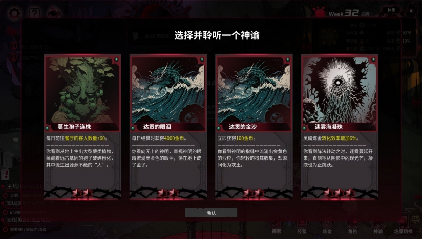 每天可以通过占卜获得神谕,带来各种收益。血月降临会吞噬所有神谕,合成至高神谕,可以在整个游戏中生效。