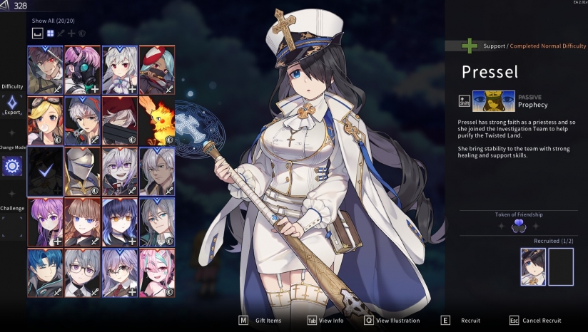 游戏共有20名玩家,每个角色都有自己独特的机制、玩法、技能和喜欢的代币。比如T0级角色铁心和普瑞斯特,前者可以极大的保证队友的生存并把护盾量转化为伤害瞬间释放,后者则能奶能输出能辅助还自带过牌的暴力奶妈;T1 级别角色有特丽莎、卡伦、乔伊、卉子等,他们在输出、治疗、控制等方面都各有特点。