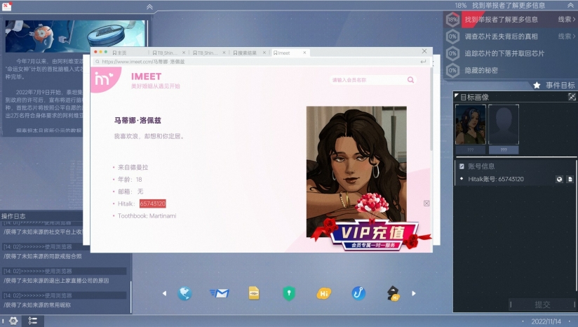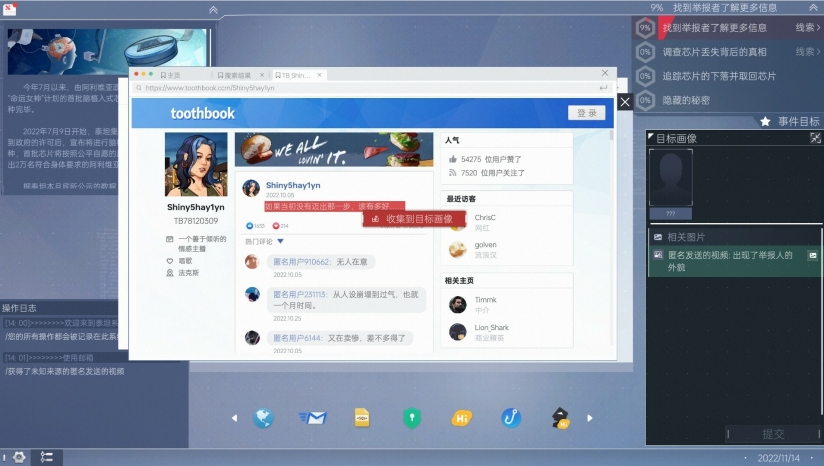 玩家需要从网页、邮件、聊天记录等文本中寻找关键信息,完成目标人物的个人信息。