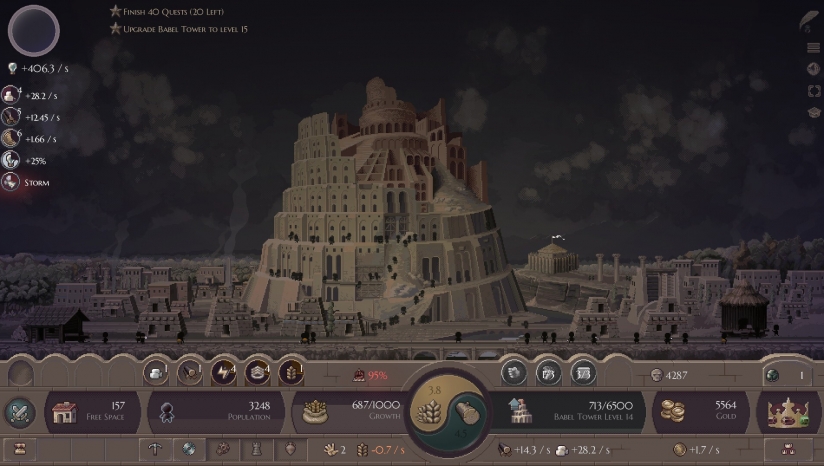 游戏融入了点击器元素,玩家可以点击进行各种操作,比如生产食物、建造建筑等。前期点击按钮生产谷物,谷物饱满的时候就会诞生一个种群。人口增加到一定程度,就会出现工人职业。工人可以帮忙生产建筑,闲散的工人也可以自动生产食物,缓解点击压力。