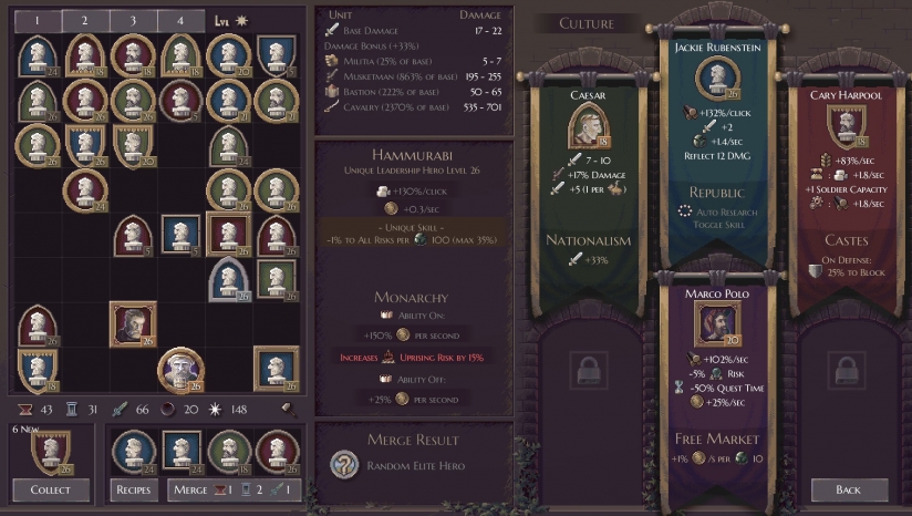 英雄在游戏中充当库存物品,可以增强玩家实力。玩家在任何时候只能装备几个英雄,但是收集不同的英雄可以对行业,财富,实力,稳定有很多新的影响。随着游戏的进展,玩家可以通过合并等操作收集更高级别的英雄,获得强大的能力。