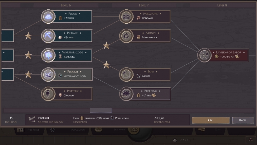 类似于传统的策略模拟游戏,玩家用科研积分换取新的建筑或功能,帮助文明进化。科研点的获取与人口和挂机时间有关。房屋是可选技术之一,引导玩家获取木材。获取木材的方式类似于获取谷物的方式。刚开始靠玩家点击,后期靠专业的人口流转。