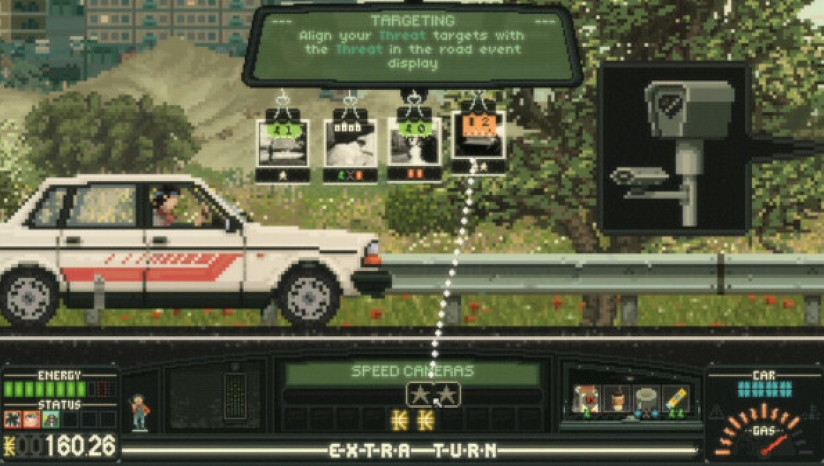 采用独特的回合制“战斗”系统来解决路途中的难题,如遇到缓慢的拖拉机、坑洼或雨水坑等。屏幕底部会以彩色图标形式呈现威胁,玩家需使用技能和手套箱中的物品应对,具有一定解谜元素。