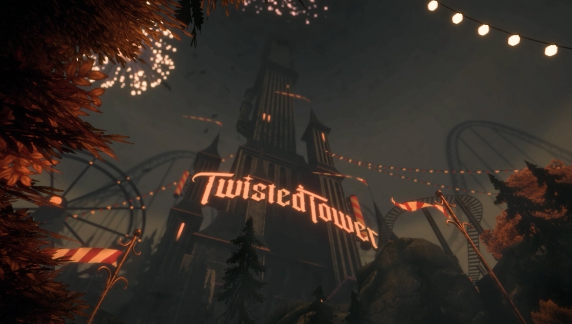 《扭曲之塔》的故事设定在1922年,灵感来源于威利旺卡(Willy Wonka)的巧克力工厂以及《生化奇兵》。玩家将扮演18岁的Tiny,一个对青梅竹马Charlotte情有独钟的年轻人。他们都是狂热的“扭曲之塔秀”粉丝,这个知名节目是由亿万富翁玩具商“扭曲先生(Mr. Twister)”主办的。