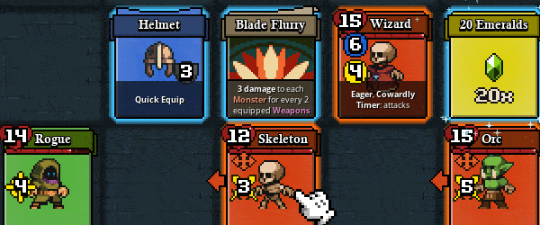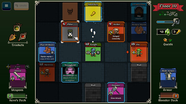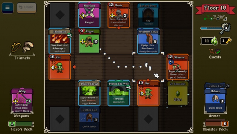 在随机生成的高塔或地下城中探索,面对不同房间布局、怪物和陷阱,收集黄金等财宝,访问商店来改善装备和牌组。