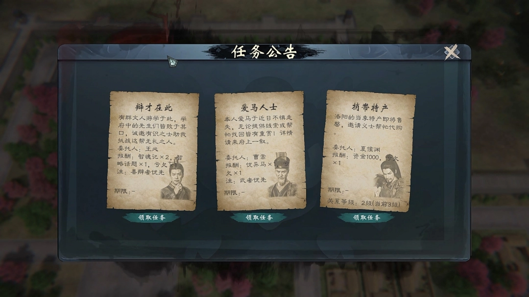 城市委托任务:在每个城市中,玩家都可以接到有趣的任务委托,帮助想要结交的武将完成委托任务是结交武将的常用方式。有一些特殊任务的效果很很逆天,比如死而复生任务可以让一个已故的武将死而复生,并成为你的家庭成员。五岳巡礼任务可以大幅提高你的能力。比武招亲任务可以直接娶到一个优质的老婆。虎父无犬女任务可以直接把好友的女儿骗过来挪为己用等等…
