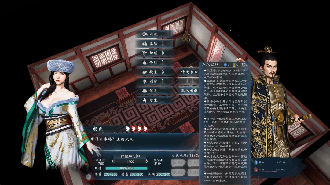 社交兴趣与话题:每个季度与武将执行的社交次数一般受到对方对玩家的社交兴趣所限制,关系等级越高,每个季度提高的社交兴趣值越多。通过送对方喜欢的礼物提高社交兴趣,是快速提高关系的好方法。此外,游戏中可以获得各种话题,将这些话题与其他武将分享时,可以提高心情,增进双方关系,并获得一些六维经验。