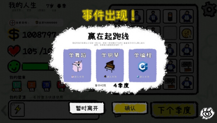 搭配贴合场景的音效,校园里有朗朗书声、课间喧闹声;职场中有键盘敲击声、会议讨论声;家庭场景则有温馨的背景音乐。随机事件发生时,音效也会随之变化,如获得横财时的欢快音效,遭遇危机时的紧张音效,全方位营造身临其境的游戏氛围。