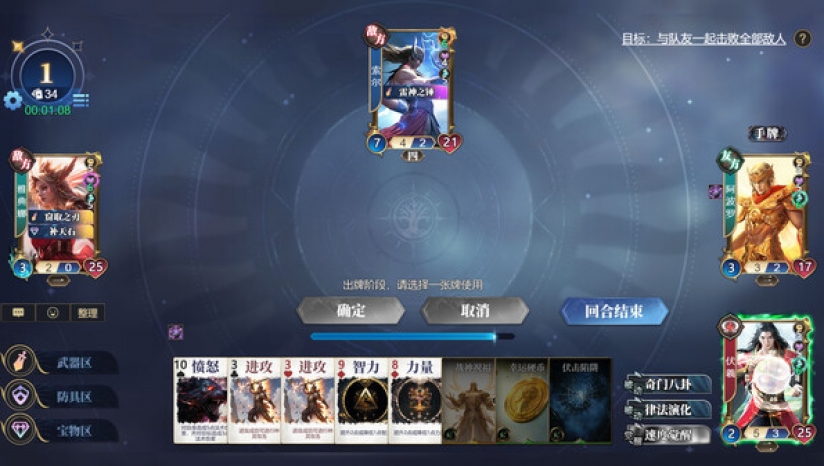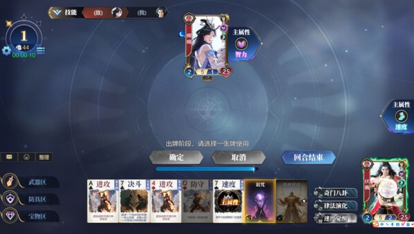 三维属性系统:角色拥有力量、智力、速度三维属性,影响卡牌发动条件与觉醒效果(如第三回合触发主属性加成)。例如,女娲主属性为智力,需搭配高智力构筑卡。