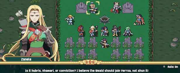 采用2D手绘与像素点阵结合的视觉设计,角色立绘细腻刻画中世纪铠甲与魔法特效,战场场景融合城堡废墟、雪原森林等多元地形。动态光影与粒子效果增强战斗表现力,如火焰魔法的燃烧蔓延、雷电技能的连锁反应。