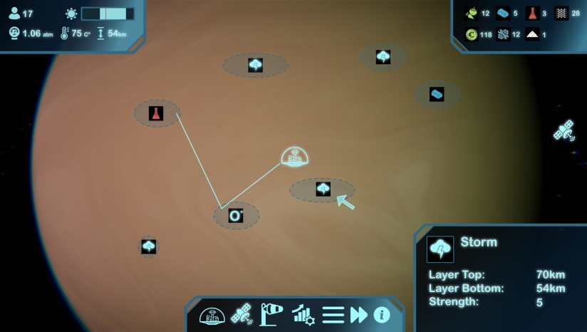 为城市添加引擎可以改变游戏规则,使城市的机动性超越单纯的浮力。这种机动性让您可以在金星动荡的天空中进行战略导航。您可以将城市定位在行星有阳光的一侧,以持续采集太阳能,躲避危险的风暴,避开硫酸浓度较高的区域。机动性也为探索资源丰富的地区、开采原子氧和发现隐藏在云层中的金属提供了机会。此外,调整浮力还可以进入更高海拔的地区,从而揭开星球的秘密,拓展城市的视野。
