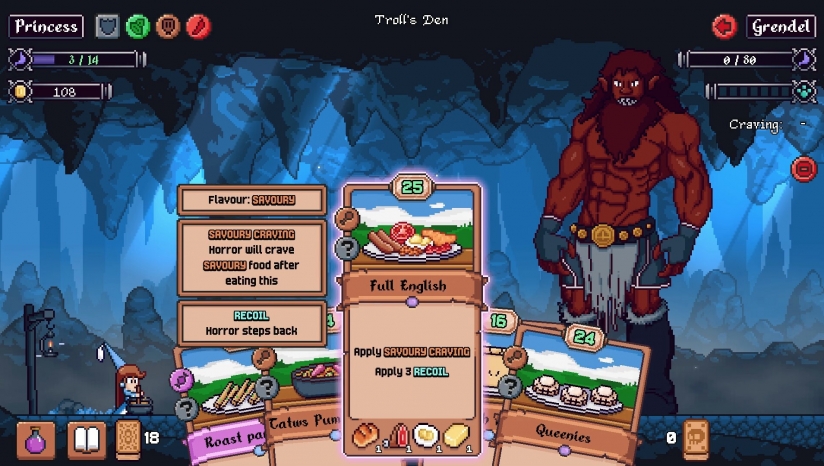 《饥饿怪物》(Hungry Horrors) 是一款结合了策略、文化和幽默的roguelike卡组构建冒险游戏。是由Clumsy Bear Studio开发制作的。在这款游戏中,玩家将要与来自英国和爱尔兰的民间传说的传奇生物对决,烹饪代替战斗。作为公主,你必须准备佳肴喂饱这些怪物,否则你将成为它们的下一顿美餐。
