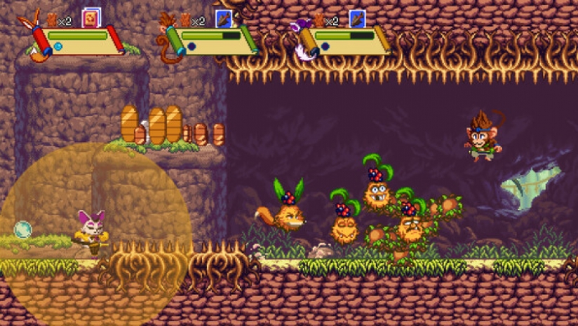 四位英雄共享基础操作,但拥有独特技能:灵狐可变身敌人短暂操控,猿猴擅长藤蔓摆荡,飞鼠能滑翔跨越地形,雪兔可冻结水面形成通路。特殊技能需消耗能量释放,配合武器升级系统(如火焰刀、雷电镖)增强战斗策略性。