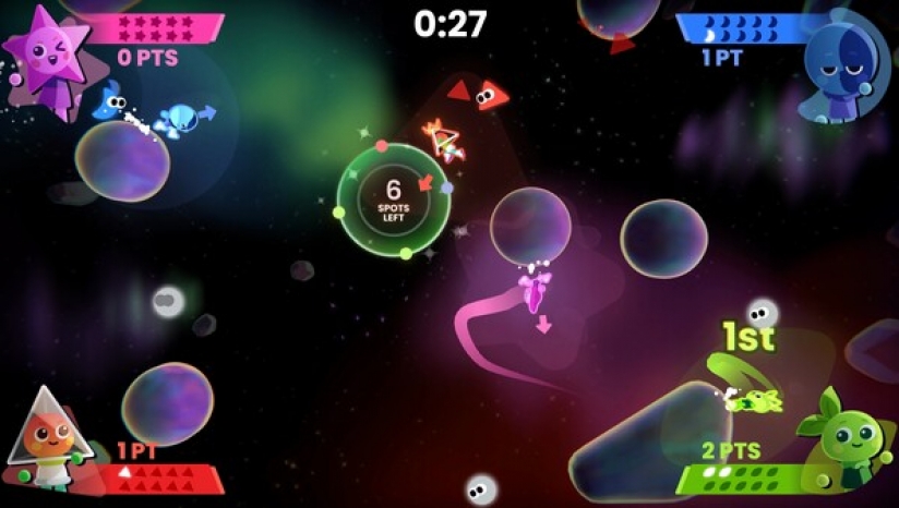 核心机制围绕重力操控展开,玩家可在墙壁、天花板自由奔跑,甚至围绕行星旋转。12款迷你游戏涵盖「星座争夺」「黑洞逃生」等主题,例如在「Event Horizon」中需躲避黑洞引力并将对手推入深渊,或在「Hole-in-One」用月球作为高尔夫球杆完成星际一杆进洞。