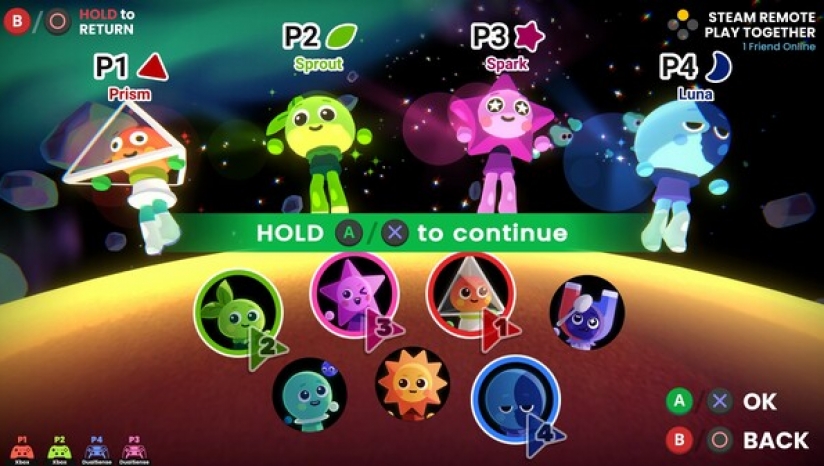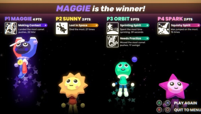 支持1-4人本地联机,通过「Comet Collect」等模式分工收集能量,或在「Bumper Stars」中碰撞对手争夺星环。特殊技能如Maggie的磁力吸附与Spark的光束冲击,需根据场景灵活搭配。