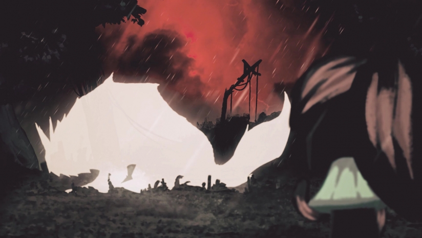 村庄的明亮色调与森林的血红阴影形成强烈反差,隐喻安全与危险的表里矛盾。