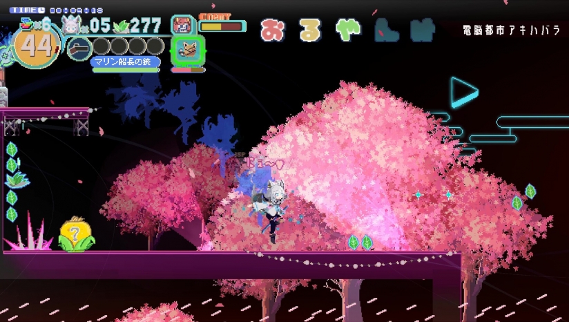 采用复古像素风格,但通过动态光影与精细动画呈现现代感。角色动作帧数充足,例如白上吹雪的剑技特效、墙壁跳跃的残影效果均展现出高速战斗的张力。场景设计上,从和风建筑到赛博都市,每个关卡均通过色彩搭配与像素细节塑造独特氛围。此外,BOSS战演出极具视觉冲击力,如宝钟玛琳的“状态异常”攻击以夸张的像素粒子效果呈现,贴合hololive成员的虚拟偶像特质。