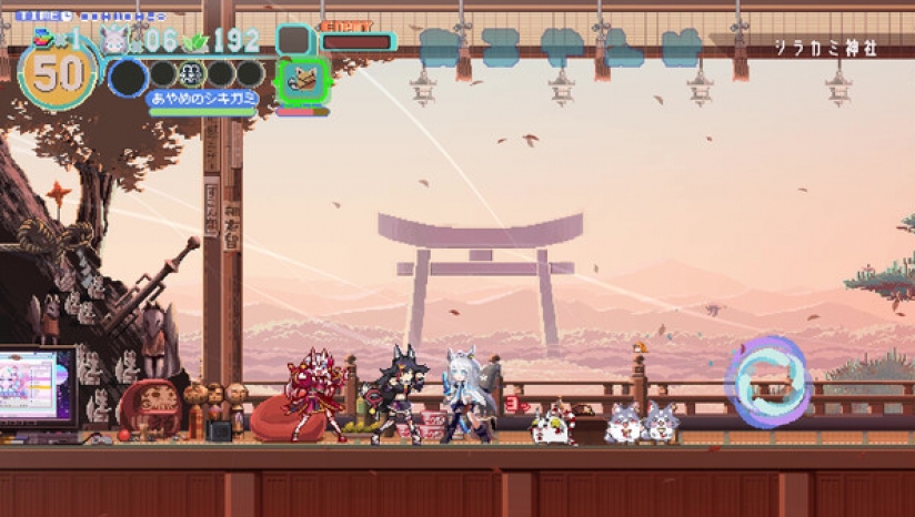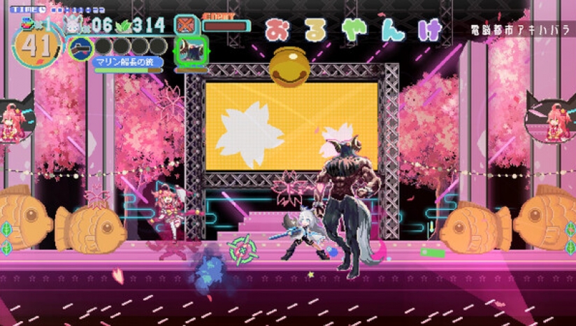 采用复古像素风格,但通过动态光影与精细动画呈现现代感。角色动作帧数充足,例如白上吹雪的剑技特效、墙壁跳跃的残影效果均展现出高速战斗的张力。场景设计上,从和风建筑到赛博都市,每个关卡均通过色彩搭配与像素细节塑造独特氛围。此外,BOSS战演出极具视觉冲击力,如宝钟玛琳的“状态异常”攻击以夸张的像素粒子效果呈现,贴合hololive成员的虚拟偶像特质。