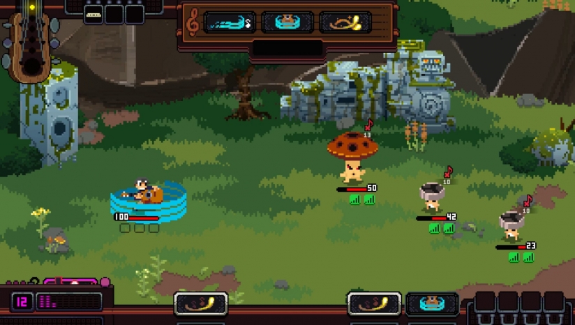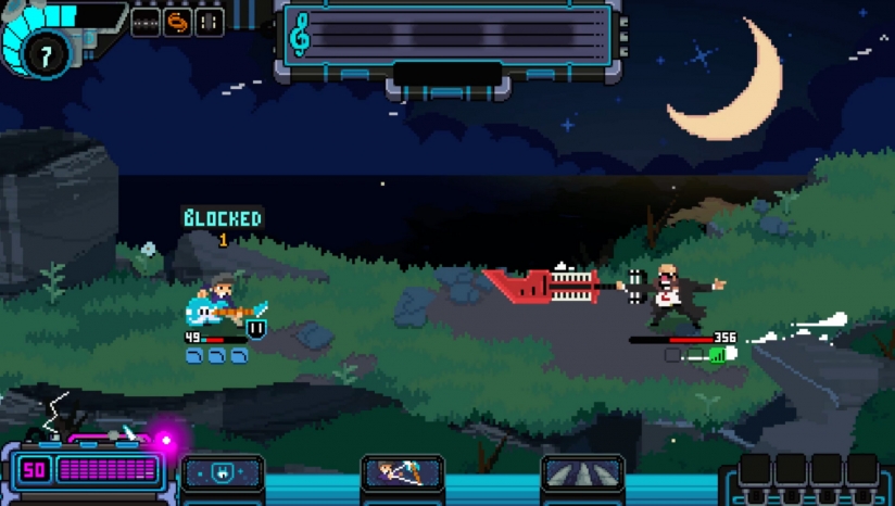 游戏采用2.5D像素美术风格,场景设计充满音乐元素:岩石随节拍震动、植物化作音符跳跃,战斗特效则以夸张的霓虹色块和动态粒子呈现,例如电吉他攻击时的电流波纹与鼓点爆炸。角色与Boss造型融入蒸汽朋克与金属摇滚美学,如机械齿轮镶嵌的贝斯、扬声器组成的怪物躯体,搭配复古滤镜和镜头抖动效果,强化战斗的节奏张力。