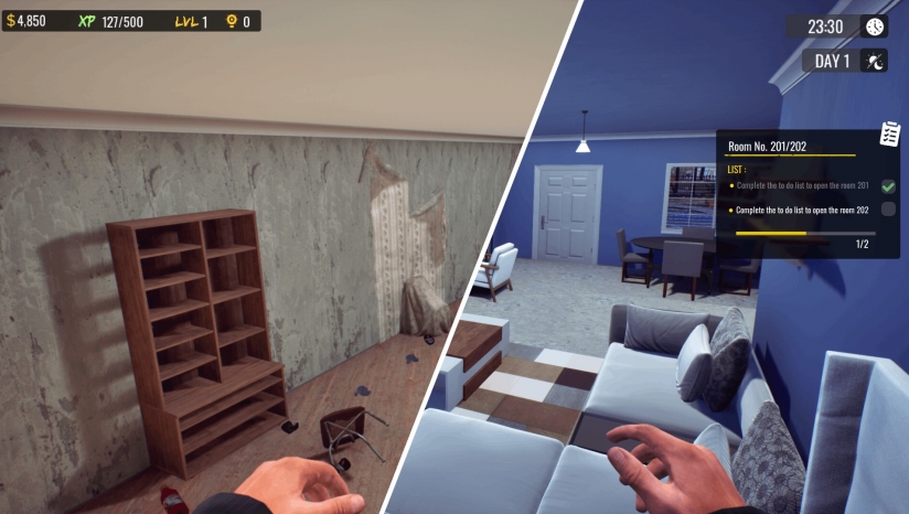 玩家需从零开始翻新破旧房间,通过粉刷墙壁、铺设瓷砖、布置家具等手段提升客房品质。游戏提供高度自由的装饰系统,从房间布局到泳池设计,每个细节均可自定义,甚至能打造专属的娱乐空间(如酒吧、游戏室等)以满足不同客人的需求。